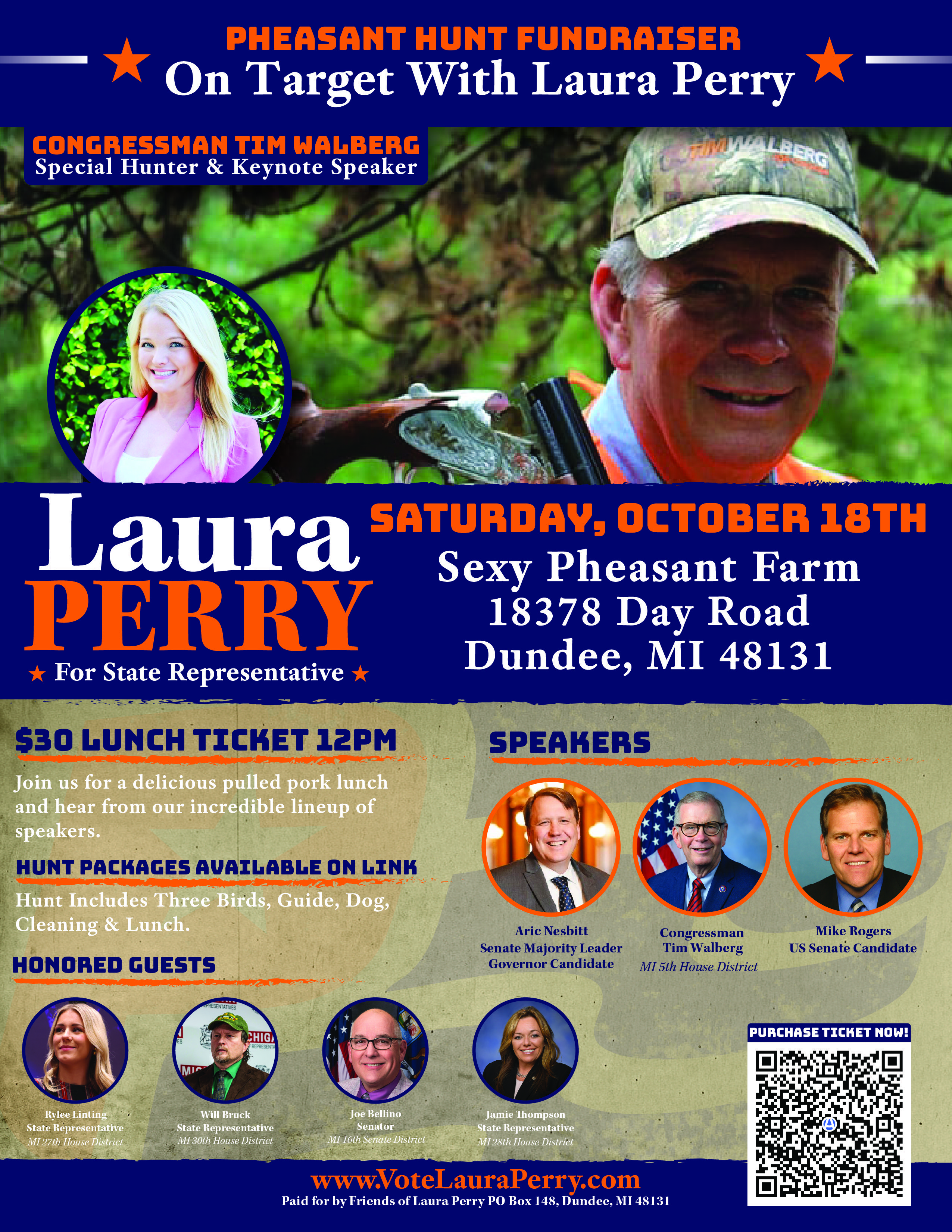 Laura Perry's campaign is hosting a Pheasant Hunt Fundraiser on October 18. Sign up now to secure your spot for the hunt. For those unable to attend the hunt, you can sign up for the lunch and speakers.