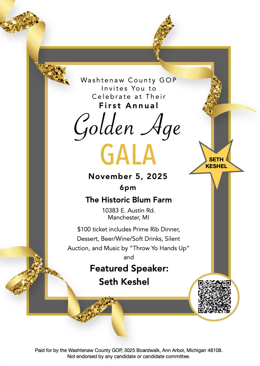 Join us for an unforgettable evening at the Golden Age Gala, hosted by your the official Washtenaw County GOP, as we rally behind President Trump’s bold vision to usher in a new Golden Age for America! Inspired by his promise to restore prosperity, strength, and unity, this event is a vibrant celebration of our shared commitment to making America great again. We'll have an inspiring speaker, live entertainment, a silent auction, and more. Enjoy camaraderie with fellow patriots as we ignite the spirit of optimism and opportunity. Together, let’s pave the way for a thriving future where America shines brighter than ever. Don’t miss this historic night—secure your place in the Golden Age!
